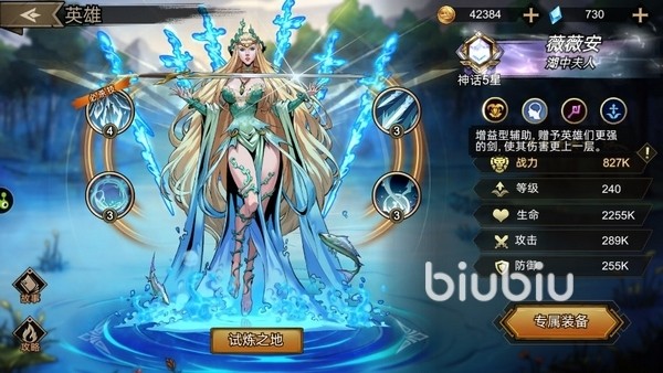 薇薇安,技能“灵动水环”,能够偷取最高攻击力敌方英雄的攻击并将其转化成己方攻击最高英雄的攻击。技能“命运之剑”随机3个目标的己方治疗或者敌方伤害,如果命中敌方还可以降低对方的攻击力。被动“湖光守护”给己方血量最低的英雄加护盾,护盾期间英雄怒气回复提升。