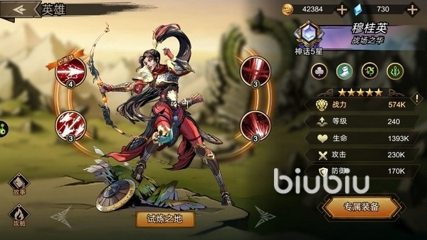 前期强烈推荐的1拖4大C,不仅能对战场有很大的影响,同时有着特别恐怖的输出。技能“刚弓连射”,3发对敌方后排的箭矢攻击,并且该技能会额外的暴击加成,并且对锁定的半血一下目标有额外攻击力加成。技能“空翻踢月”受到近战攻击的时候会将目标踢飞造成击退与伤害,升级后还附带眩晕的效果。这个技能可以有效放置敌方近战近身,为穆桂英的生存提供保障。