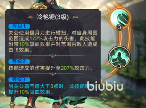 这个名字想必大家都不陌生,即使是不玩游戏的,毕竟是经典人物,沿用到游戏当中,他属于坦克型的角色,虽然是坦克,但是也有输出能力的,他的攻击方式也是比较特别的,”冷艳琚”是普通攻击,利用手中的偃月刀对对手造成高额物理伤害,而且这个技能还附带一定的吸血效果,如果击中对手的话,那么敌人还会遭受到击飞的效果,所以作战能力是非常可以的。