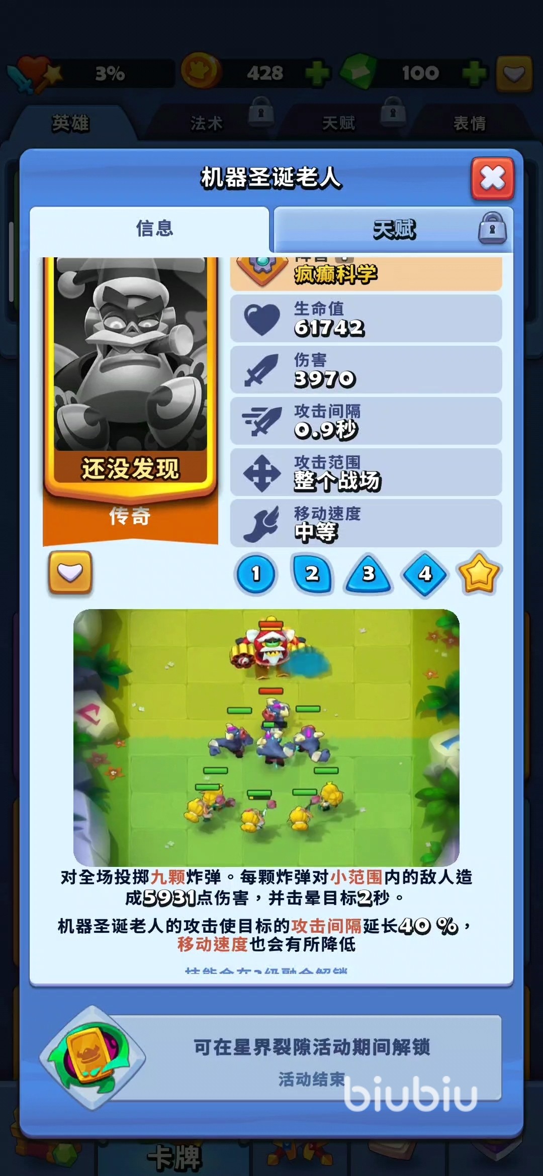 从基础属性来看,机器圣诞老人拥有61742的生命值和3970的伤害,攻击间隔为0.9秒,属于中速型全场攻击单位。他的攻击范围覆盖整个战场,无论敌人站在何处,都能被他的技能命中,在持续输出方面表现非常稳定,整体节奏平滑且输出手感十足。