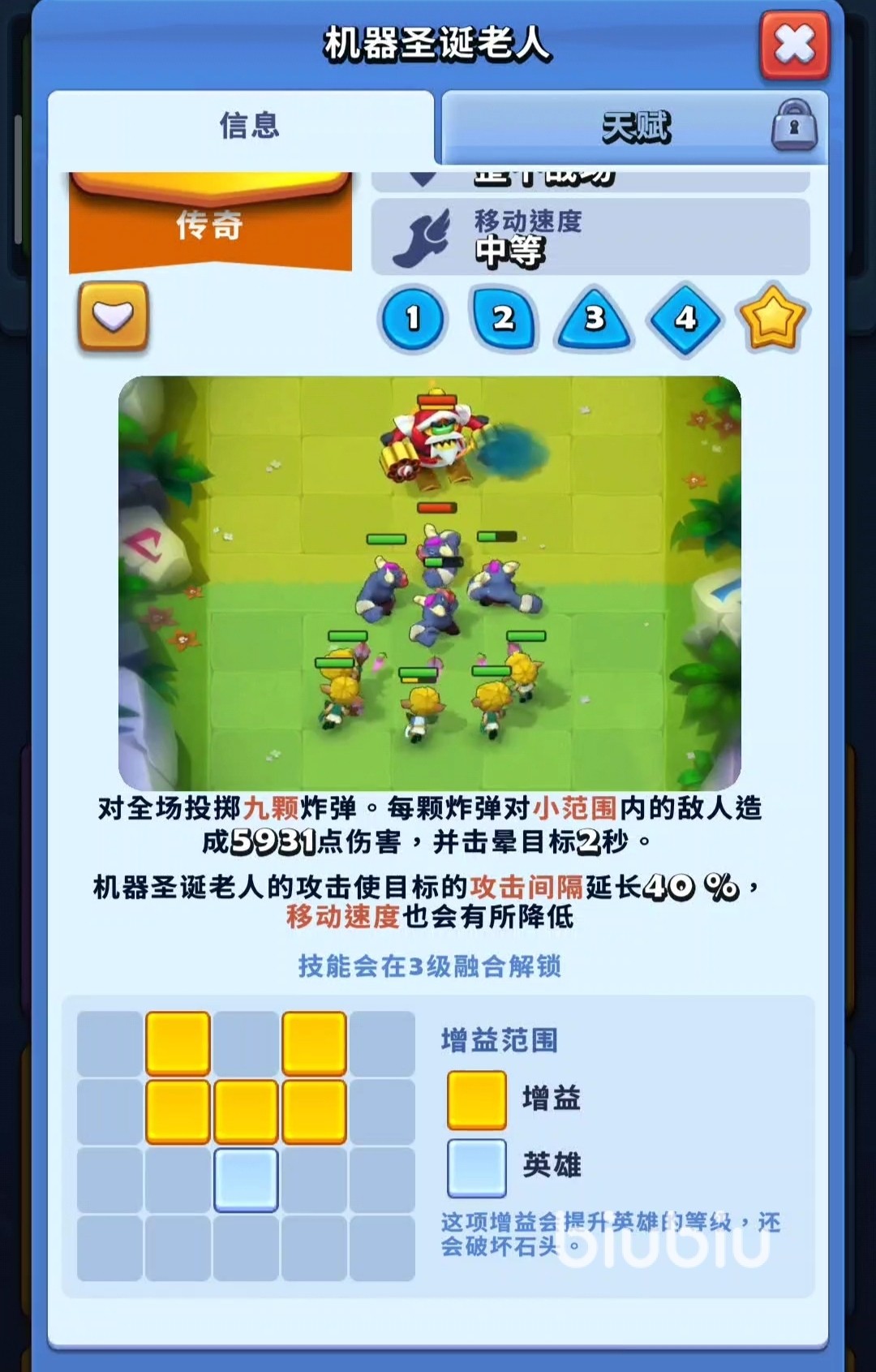 机器圣诞老人的核心技能会在3级融合后解锁。他会向全场投掷9颗炸弹,每颗炸弹能对小范围内的敌人造成5931点伤害,并使目标眩晕2秒。此外,他的普通攻击还能让被命中的敌人攻击间隔延长40%,移动速度也会下降。这让机器圣诞老人不仅能群体输出,还能削弱敌人的节奏,极大提升队伍整体的控场能力。