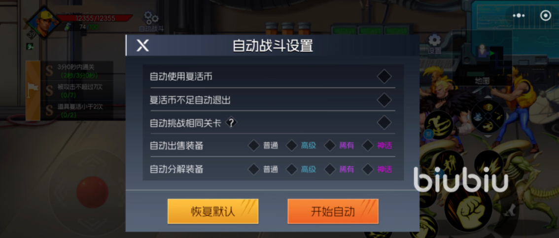 首先大家需要购买“超级月卡”,这样才能获得30天自动战斗权益,然后开始战斗后大家点击场景中左上角像是齿轮一样的按钮,就会开启自动战斗界面,里面会包含不同的功能选项,如果勾选自动使用复活币,就会自动在角色死亡时自动使用,直到复活币用完或者通关。