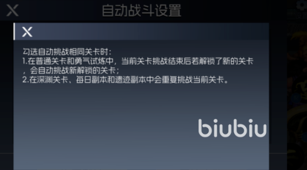 勾选复活币不足退出,就会在角色死亡后自动退出关卡,勾选自动挑战相同关卡在深渊、每日副本和遗迹副本会重复挑战当前关卡,当然在普通关和勇气试炼中若解锁了新的,会自动挑战新关卡。