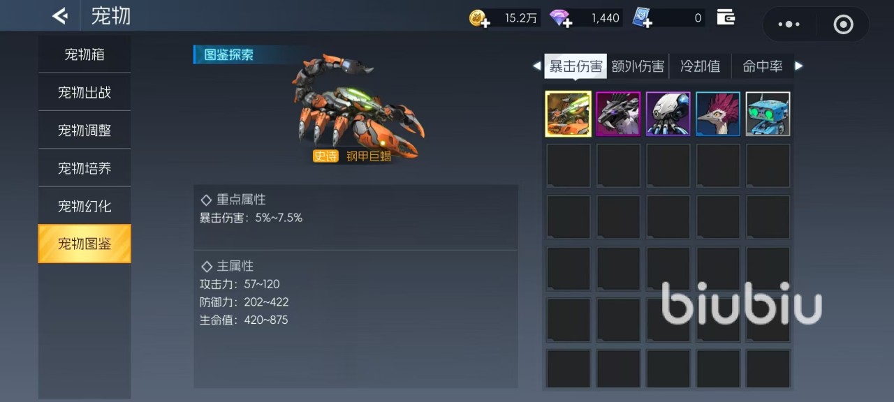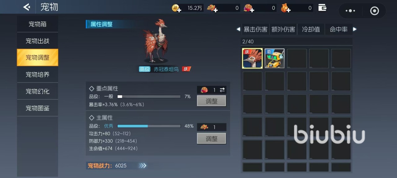 如果对当前宠物的属性不满意,就点击宠物调整,在这里可以对属性进行调整,力求得到最适合自己职业的属性。至于如何去选择宠物,也需要根据自己的职业来确定,宠物主要是按照提升到属性进行划分,分为暴击率、暴击伤害、额外伤害、冷却值和命中率这几大类。如果职业需要频繁释放技能,就可以选择能降低冷却值得,如果职业需要增加命中率,就选择重点属性可以提升命中率的。对于大多数职业来说,最有性价比的还是提升暴击和暴击伤害,这才是属性的重要来源。比较适合的宠物有钢甲巨蝎、钢牙剑齿虎等。