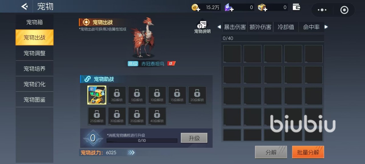 有了宠物之后需要做的就是让宠物出战,只有出战位置的宠物才能获得重点属性和主属性的额外增幅。除了出战位置还有助战位置的宠物,助战宠物只能激活重点属性和主属性。宠物的品质越高,重点属性和主属性的加成就越高,所以尽量选择当前品级最高的作为主战。宠物可以通过进行培养来提升等级和星级,提升之后属性能得到大幅度的攀升。也可以在培养的时候对宠物进行锁定,锁定之后的宠物无法被分解和赠送等操作,防止误操作。