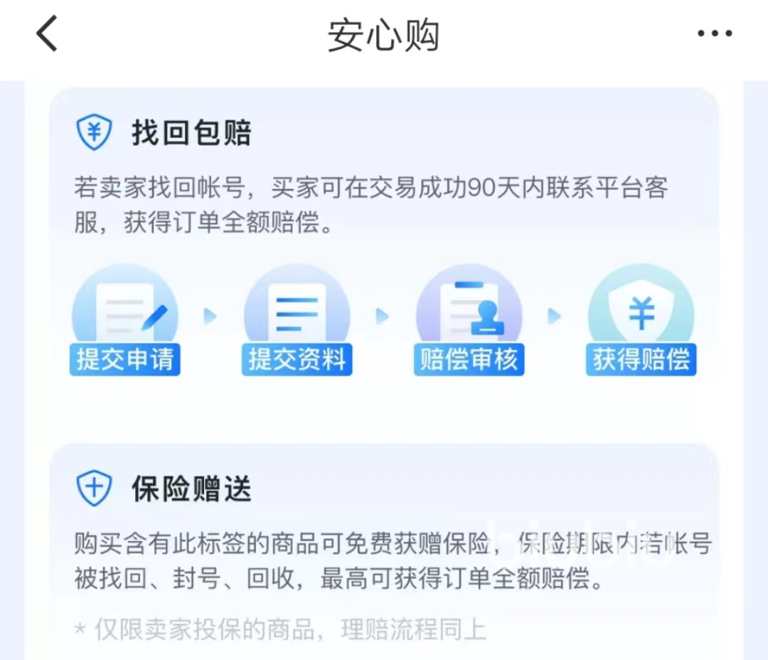 其次是买号的安全性,无论什么交易,安全都尤为重要,游戏账号这种虚拟资产更是如此,交易猫上除了整体流程规范,各种信息验证带来的安全性之外,在商品方面还有部分商品的找回包赔以及保险服务,让你安心购买。