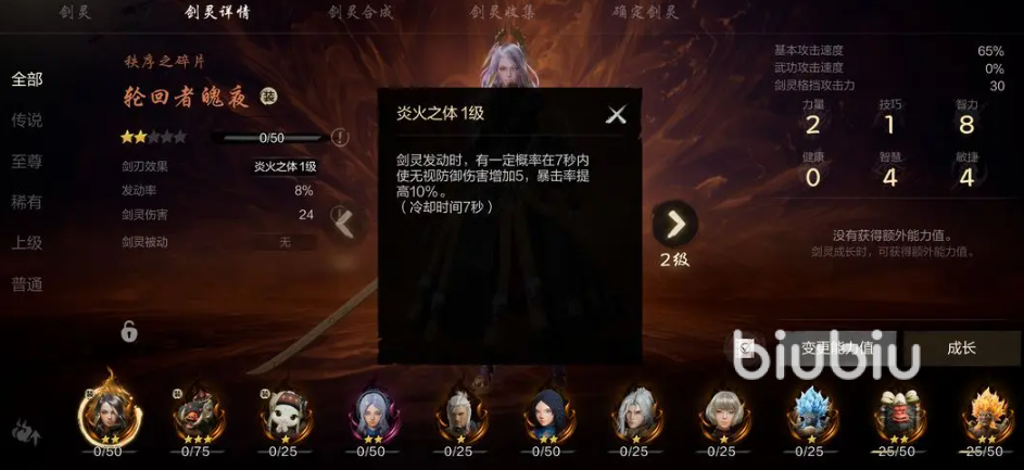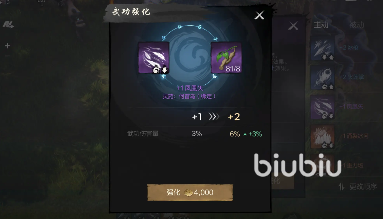 主动技能升级提升的武功伤害较多,因此要先强化那些可以CD比较短的技能,像是火莲章、冰轮,CD越多释放的频率就越高,也可以造成更多的伤害,后续还可以给武功进化,增幅很大。强化被动可以提升技能的属性加成倍率,建议先强化那些加贺才呢过比较多的,例如“冷静”则可以加智力,是最优先点的。动作技能的强化效果有许多,倾向于是根据自己的需求来,这里推荐强化一些触发频率高的,例如“火冰连炮”、“破阴指”。