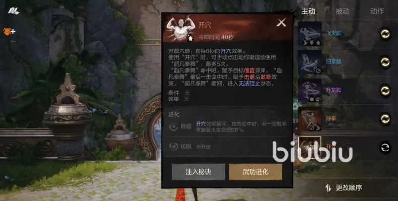开花效果叠了3次更是附加眩晕,打怪物之外的敌人则是击退加眩晕。开穴,附加6秒的开穴效果,使用后可以手动使用动作键的“超凡拳舞”,命中打出僵直,并且拳舞的最后一击也有击退和眩晕,整个拳舞期间也是无法组织的。