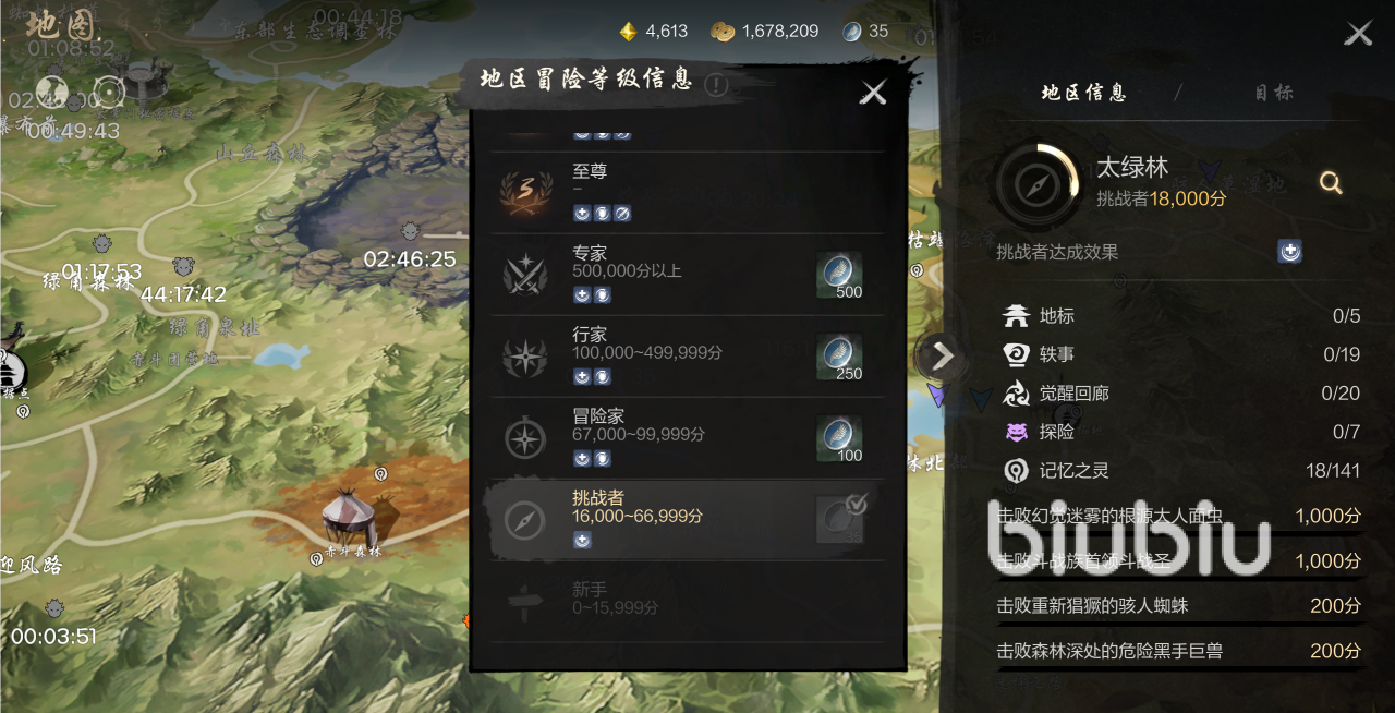此外,地图探索在前期的时候,小伙伴们每日也要去做。有很多的地图点都是要进行探索的,像是一些地标觉醒,回廊探险以及记忆之灵等等,还有挑战怪物,解锁之后都可以直接传送过去。有条件觉醒回廊的话一定要解锁,因为可以得到丰厚的属性奖励,提升个人的实力,而挑战怪物则是可以得到一些质量比较高的饰品,命运石以及箱子金币等等。探索地区可以提升地区探索分数,当分数达到一定的指定目标时,大家就可以领取到商城的积分了,可以用来购买物品。