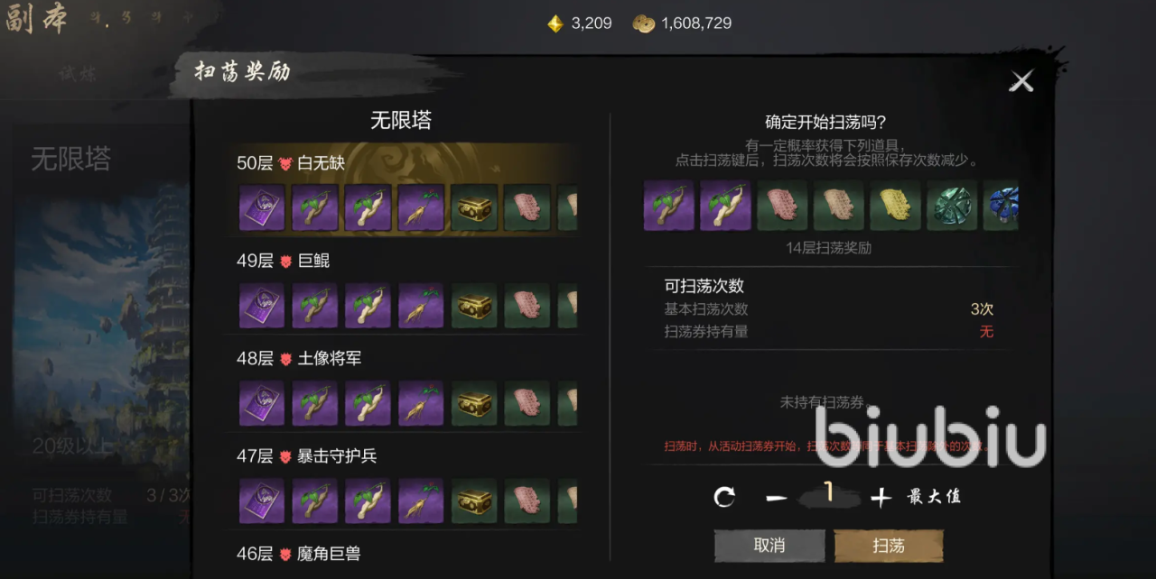 无限塔也就是爬塔类玩法,目前一共开放50层,玩家每成功通关一层都能得到丰厚奖励,通关到最高层的话则能直接获得传说级别的剑灵召唤书,可以用起召唤出极其稀有的传说级剑灵,如果大家处于已经全部通关或无法闯过更高层数的情况,可以使用扫荡功能对已经通关过的楼层进行扫荡,楼层越高扫荡的奖励越丰厚,每天的4点都会补充一次扫荡次数,最多能累积三次,大家千万别忘记使用。