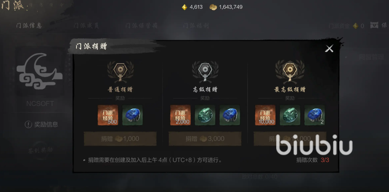这边建议小伙伴都参加门派,门派除了能带给我们归属感,最重要还是每天都能从门派中获取资源,玩家只要每天在门派进行签到就能获得绑定神石的奖励,除了签到外进行门派捐赠也能得到强化石的奖励,玩家每天都能进行三次捐赠,捐赠有不同档位,需要大家花费不同数量的金币,这边推荐玩家直接进行最高级捐赠,能得到大量强化石。