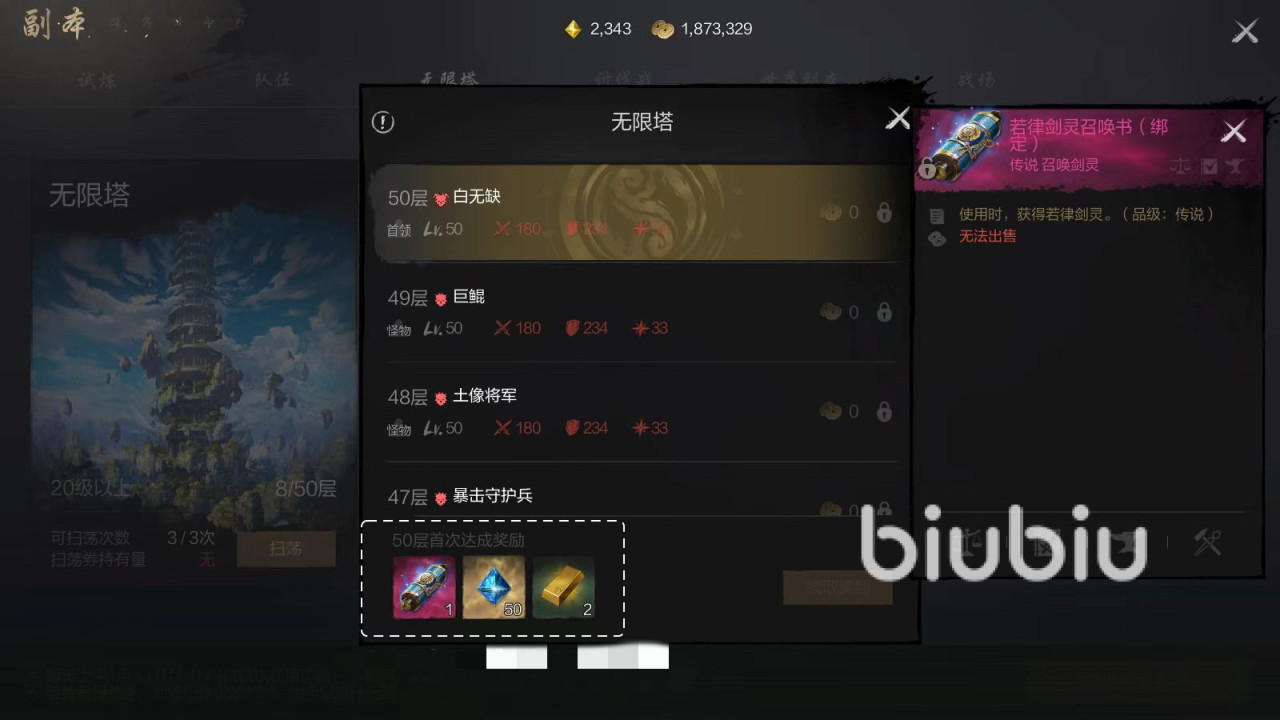扫荡可以获取的奖励是在前面基础上进行增加,其中1~19层奖励各种灵药、秘诀和寒玉碎片用于强化武功、武器、防具。20~29级增加了试炼副本充能石选择箱作为奖励,30~50层则增加了奖励获得券,增加普通组队副本的额外次数等。其中第10层,20层,30层和40层可以获取武功秘籍,最后50层能够获得若律剑灵召唤书,可以召唤出传说剑灵。目前根据资料,无限塔只开放到50层。