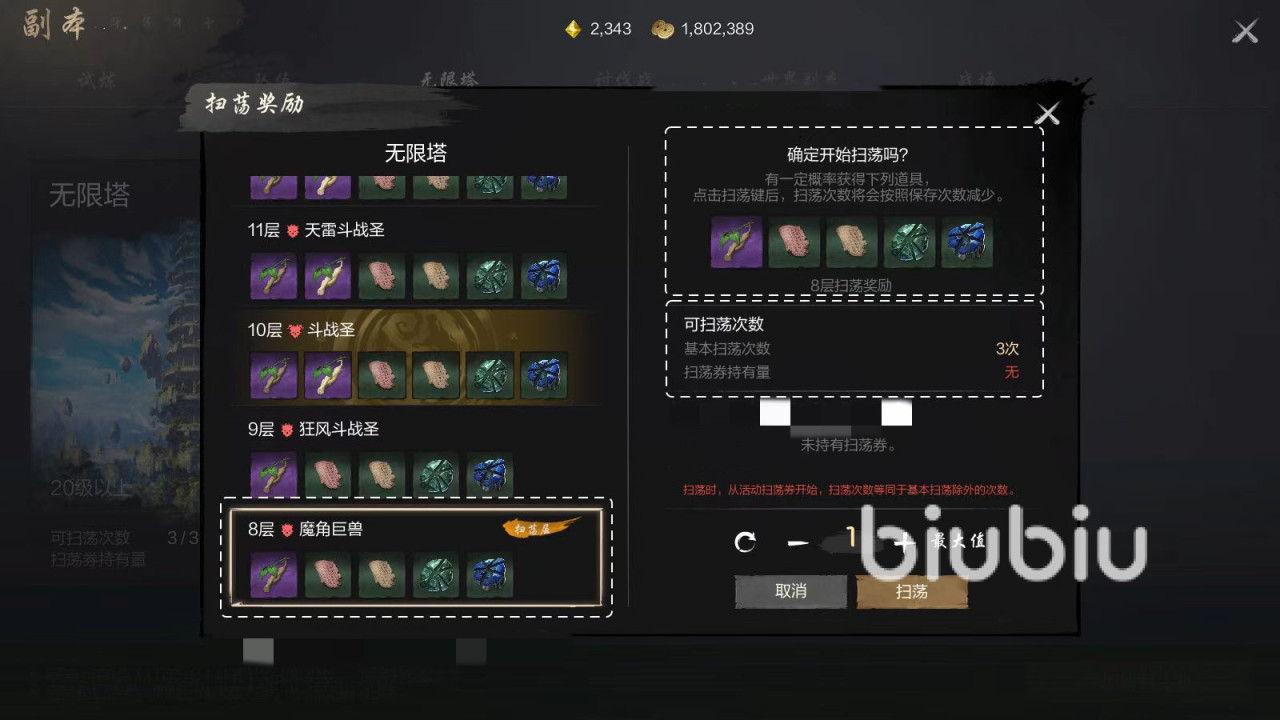 最后小编给大家总结一下,无限塔副本的一些技巧,首先这是一个优先度非常高的活动,一定要及时去刷,每天都会恢复一定的扫荡次数,所以每天尽量爬到更高层次的塔,然后再使用扫荡,这样可以最大限度地获得奖励。主要奖励包括武功强化材料、装备强化材料、试炼副本充能石选择箱以及其他相关奖励等。