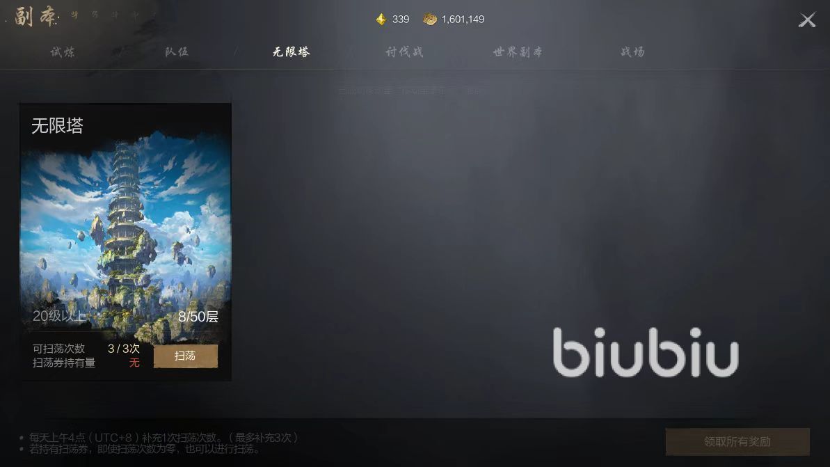 无限塔属于单人副本的一类,在20级以后开启,每层boss只能刷一次,只有先战胜了前一层的boss,才可以继续往下继续战斗,每次击败boss都可以获得首次奖励。挑战boss次数是不限的,也就是大家可以一直往下挑战下去,一直到过关为止。但是在挑战的时候也要先看一下推荐等级和能力值,不然也只能是浪费时间。当家在当前层级进行扫荡时也可以获得对应奖励,每天有三次扫荡次数上限,会在每天上午4点补充一次。
