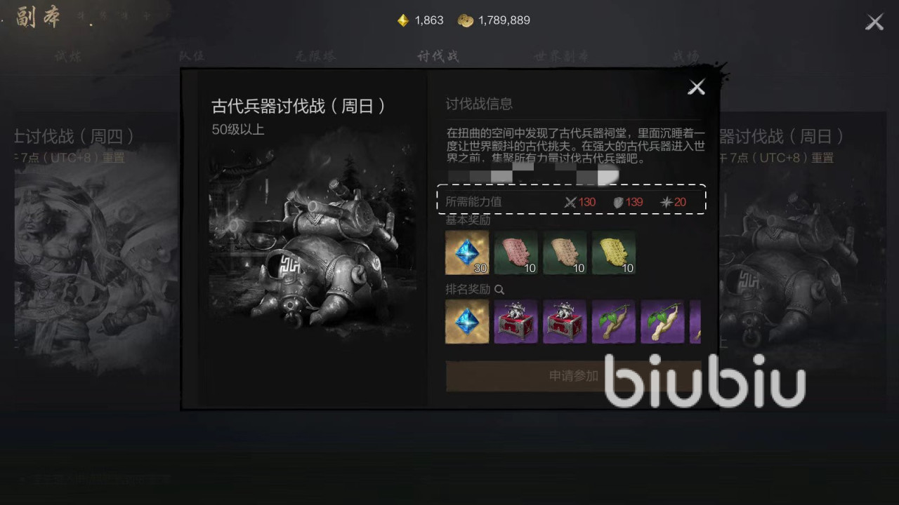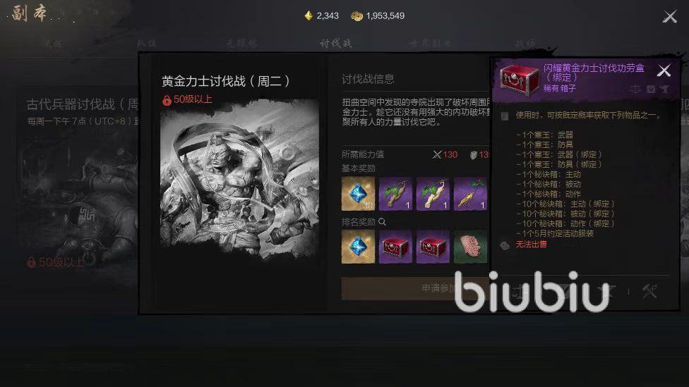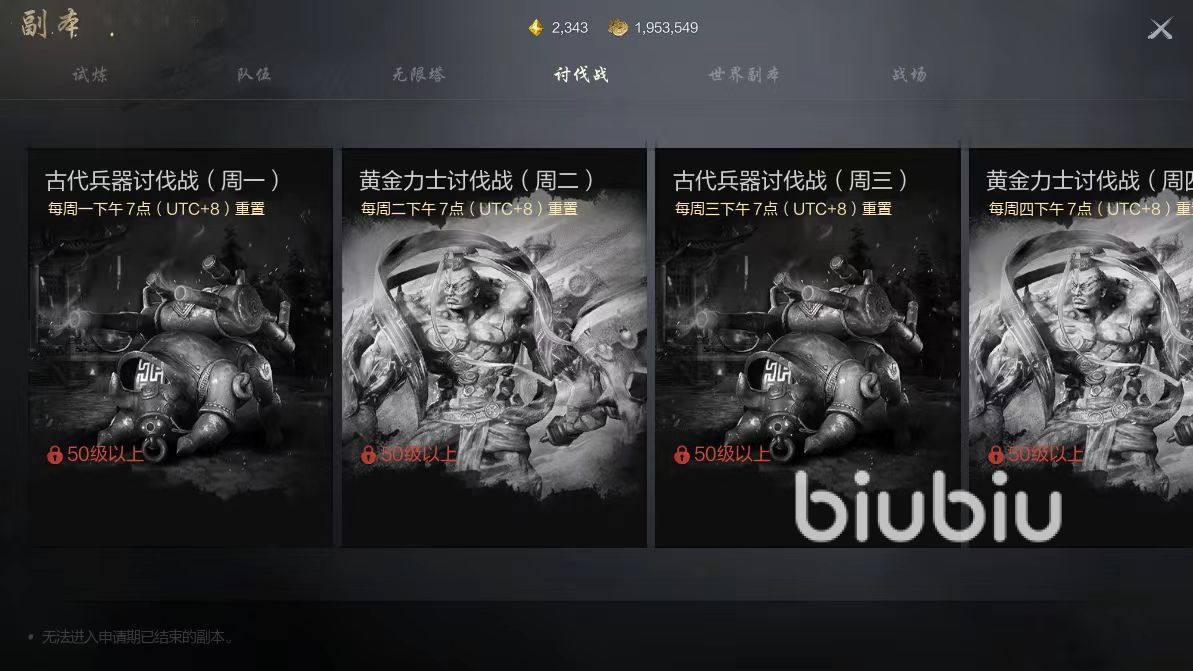 当大家在达到50级之后,就可以参与副本讨伐战,属于主动副本类型,需要和队友配合才能够完成。副本属于限时开启,只有在每天晚上19:30~20:00才能够进入其中。大家在界面中可以看到boss有很多,但是主要只包括两类,第1类是古代兵器讨伐战,另一类的是黄金力士讨伐战。这两种在时间方面还有区别,古代兵器讨伐战在每周的一、三、五、七下午7点进行次数重置,黄金力士讨伐战在每周的二、四、六,下午7点进行次数重置。