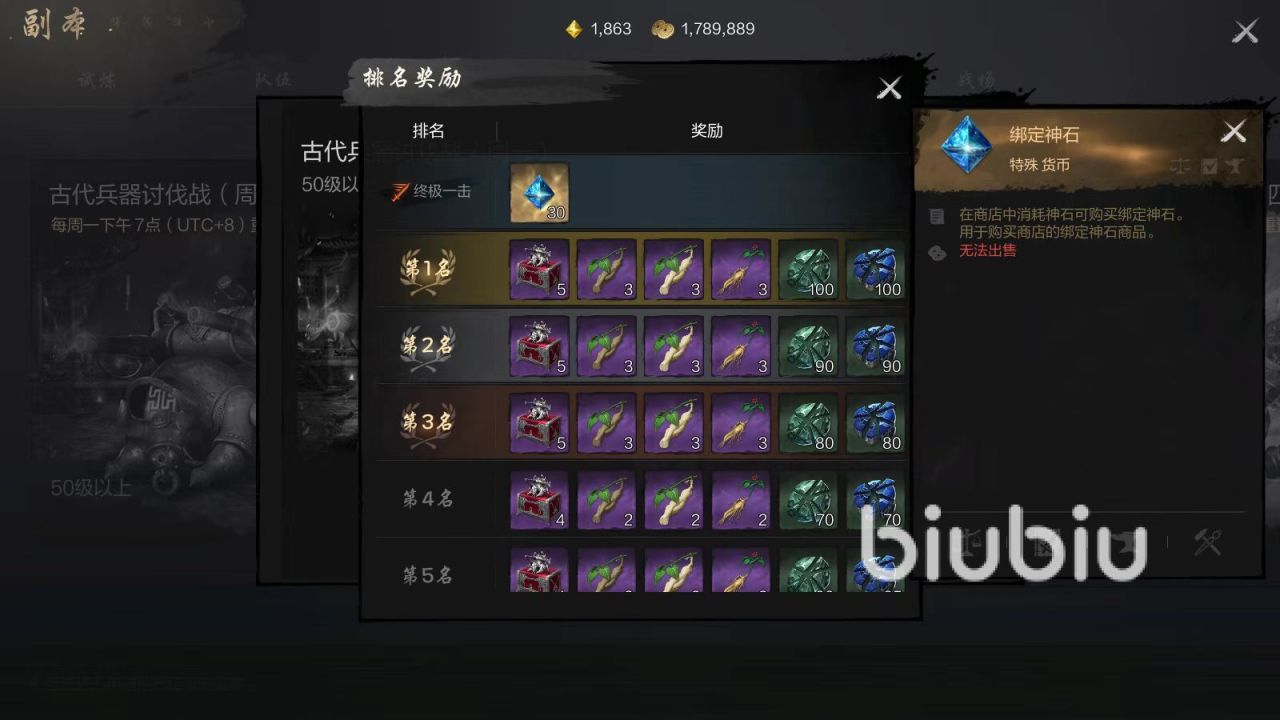 大家只要参与讨伐战,就可以获得基本奖励,后续还有排名奖励,是基于在本次挑战中参与对副本boss造成伤害贡献度进行排名,造成伤害越高,排名就越靠前。如果最后拿下终极一击,还有额外绑定神石奖励。在古代兵器讨伐战中,主要奖励包括30枚绑定神石,以及主动和被动秘诀,排名奖励包括功劳盒、灵药、寒玉碎片等。在黄金力士讨伐战中,基本奖励有30枚绑定神石,何首乌,白首乌,山参,排名奖励包括功劳盒、灵药、寒玉碎片。