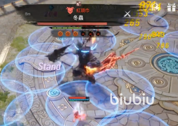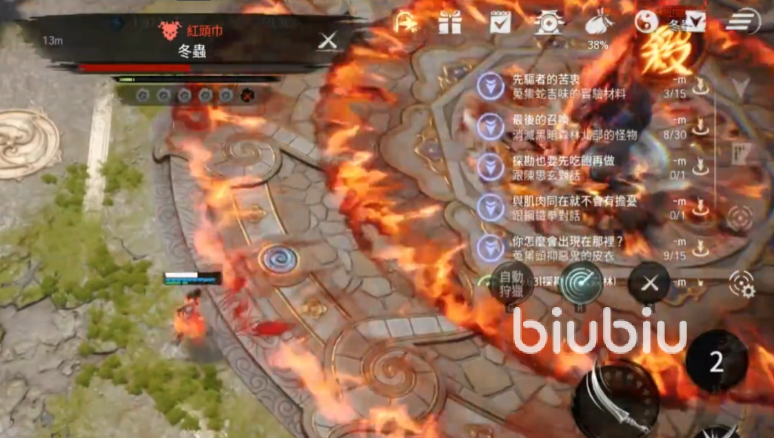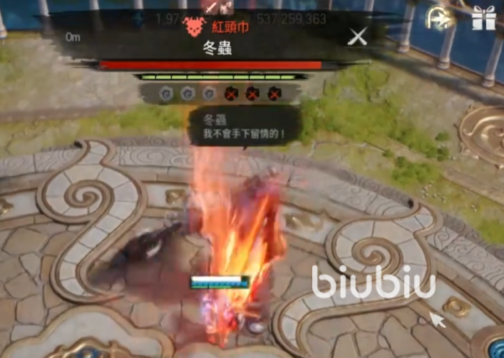 冬虫的第三个技能是在原地释放三次不同位置的火圈,第一次大家要站在他的边上,并稍稍往第二圈的圈边靠近,在下砸消失的一瞬间走到第二圈和第三圈的边上,最后脱离范围,这招是必杀,不躲开就直接GG,在打的时候一定要提前就站在下一个圈边,因为三次蓄力之间的间隔非常短,不从圈边过去的话时间会来不及。