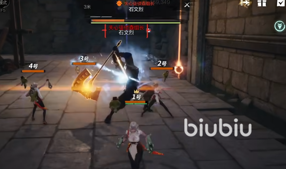 第二个介绍的boss是在中段小广场的第二个boss——石文铁,和第一个一样,他会在被打后很快释放出一个合击技,可以使用打断技能将其断掉,不然会造成全员高额伤害,和第一个boss相比他的技能要复杂一些,看到他手里捏蓝以后要远离一定距离,不然会被击倒然后衔接一个浮空,要交解控技能不然会被打到残血,这两个机制躲开以后也是直接输出就可以。