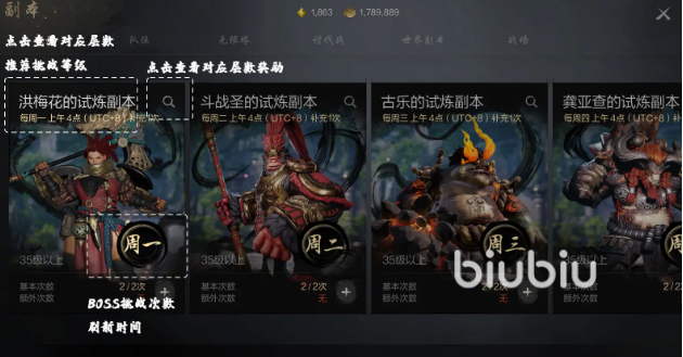 试炼副本其实是单人的挑战副本,和其他副本不一样的是不需要先打小怪,再慢慢刷到boss,而是直接面对boss省去跑图的环节,每个boss每周的基础挑战次数只有两次,而且不同boss的挑战次数的刷新世界还不太一样。