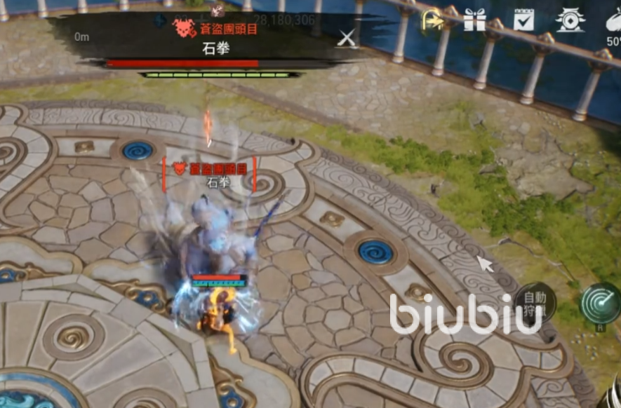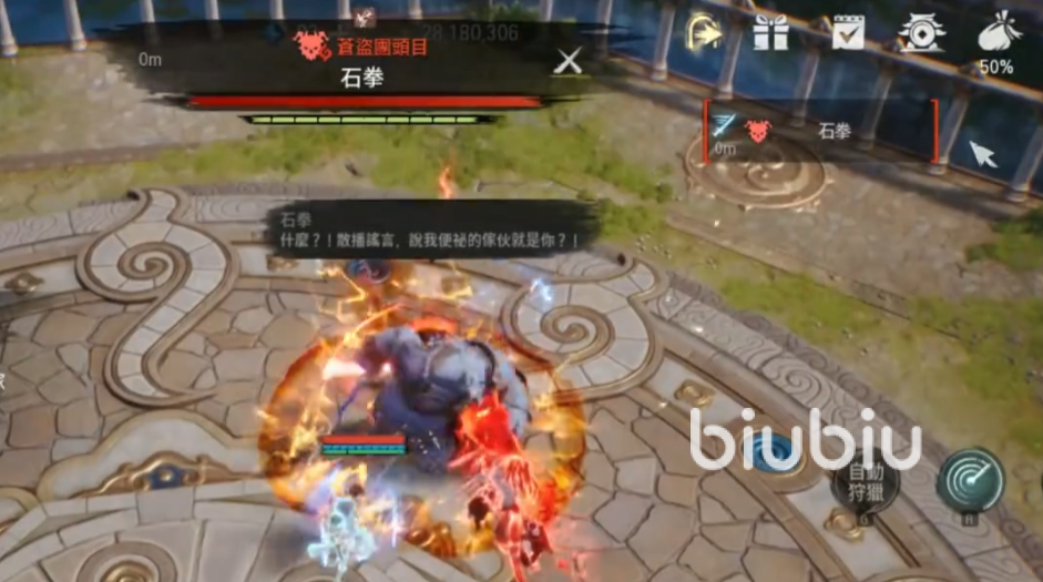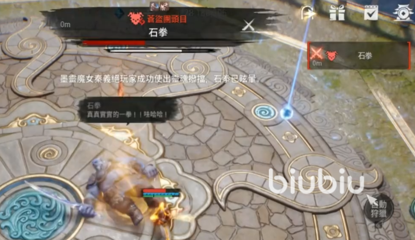 石拳的第二个技能是一个合击技,他会高高跃起,然后将自己手上的匕首狠狠往下扎,这个技能的应对方式也有两个,第一个就是直接使用格挡技能把这个技能挡住,还能让他进入到一个眩晕状态,能跟上后续的输出,还有一个办法就是在他释放的时候快速离开这个技能的攻击范围,就可以看到boss把匕首扎到地里拔不出来的场景,这时候也能加紧进行输出,两种方式相比第一个难度更大一些,但是后续的输出会更高。