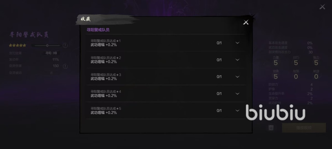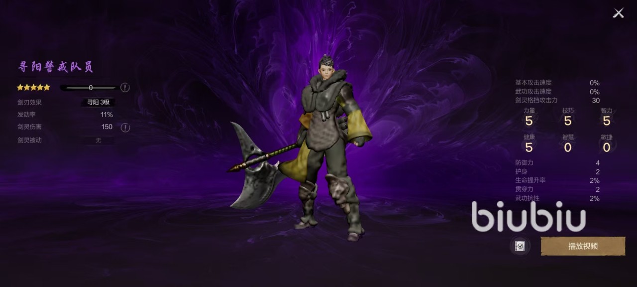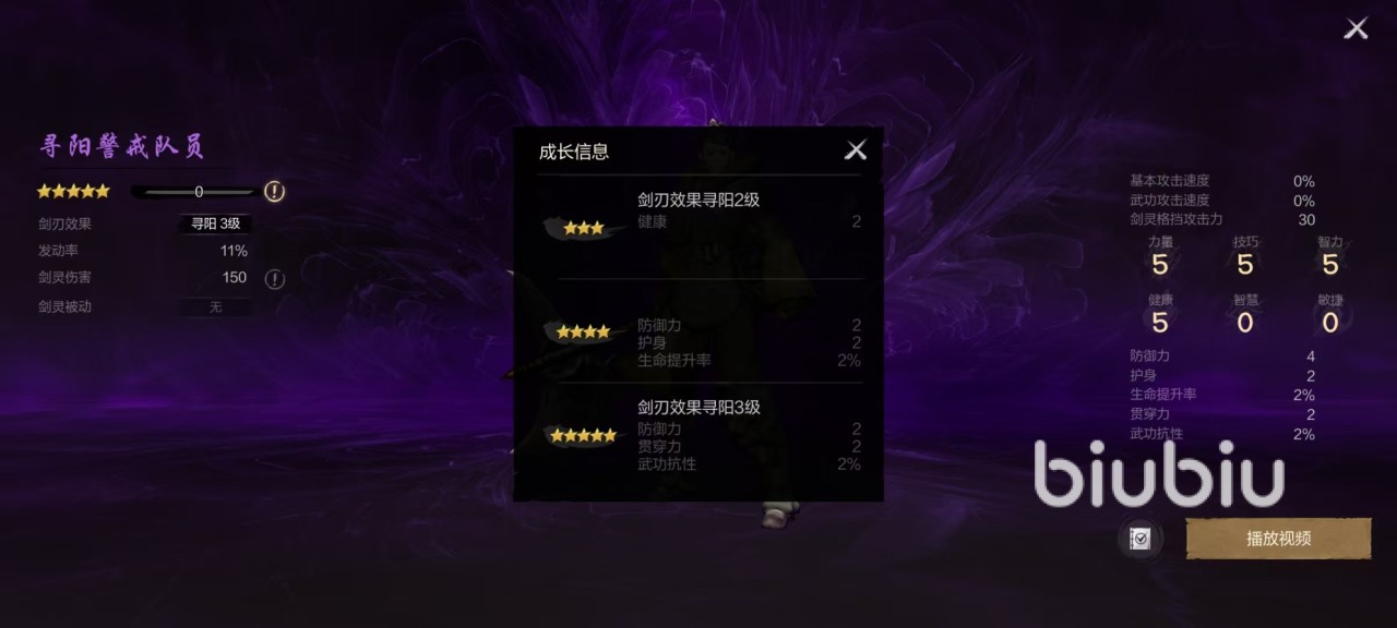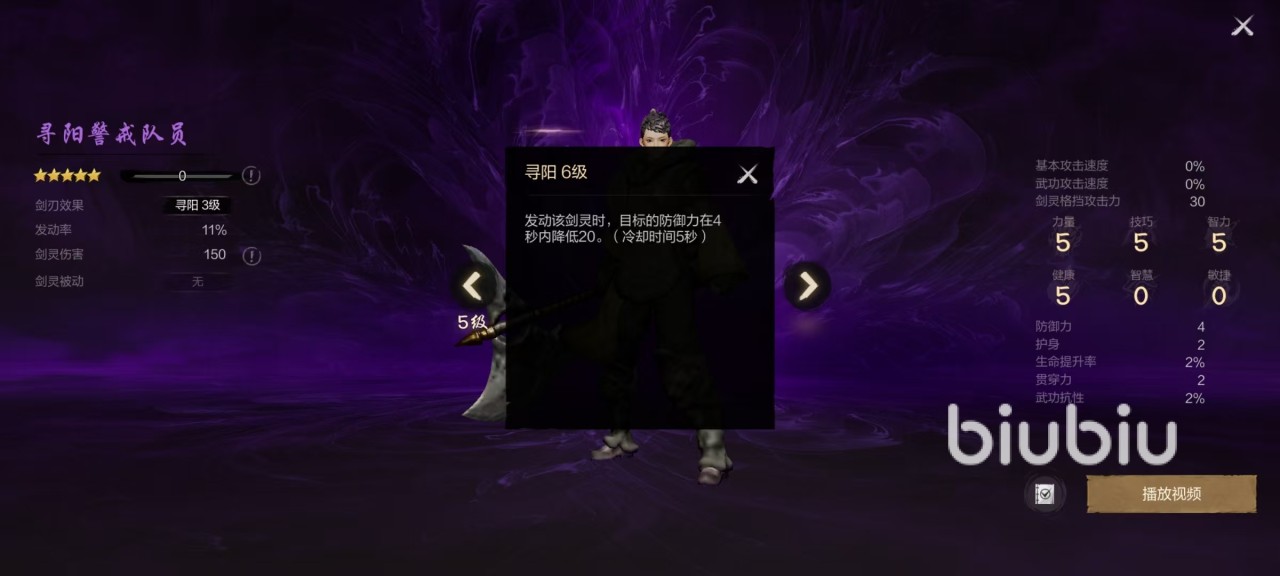在自身其他属性方面,寻阳警戒队员的力量、技巧和智力以及健康的4项属性都是5点,智慧和敏捷为0。另外还有4点防御力,两点护身,两点贯穿力等属性。属性比较差是这一品质的普遍特点,所以无法成为主要剑灵,只能当做辅助。