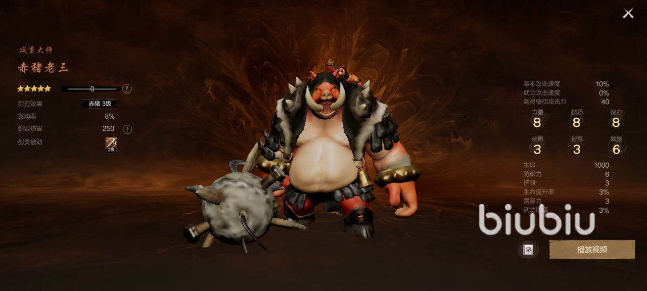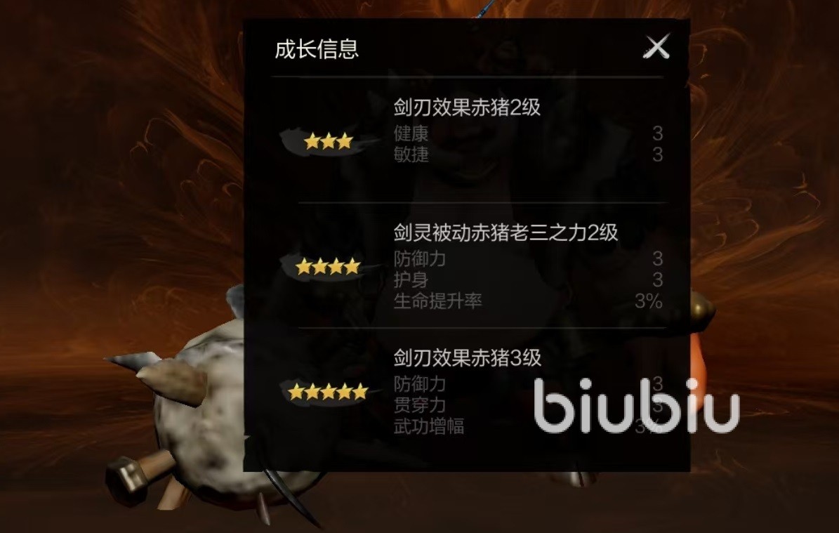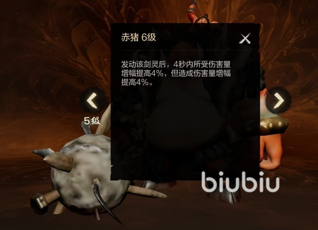 再来看一下剑刃效果,赤猪老三的剑刃是赤猪,最高能提升到6级。在发动该剑灵后,4秒内受到所有伤害量增幅提高4%,但造成伤害量增幅提高4%。这样的效果就是以自身受到更多的伤害为代价,换来更为狂暴的伤害输出,虽然比例相同,但对玩家来说依然是有优势的,只要自身输出足够犀利。自身所具有的被动是赤猪老三之力,达到两级时额外增加1000点生命力。有了被动所带来的生命力加成,自身虽然多受到了一些伤害,但是对于生存并没有太大的影响。