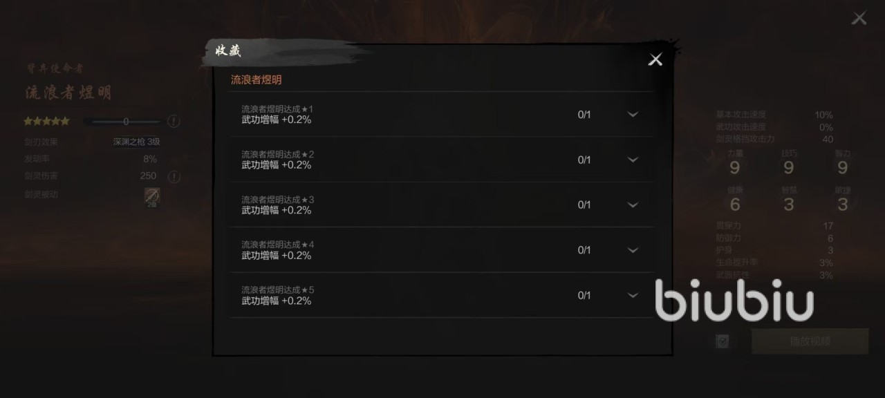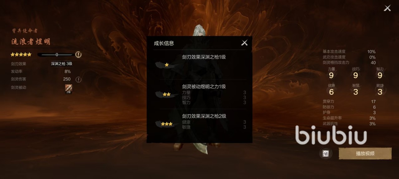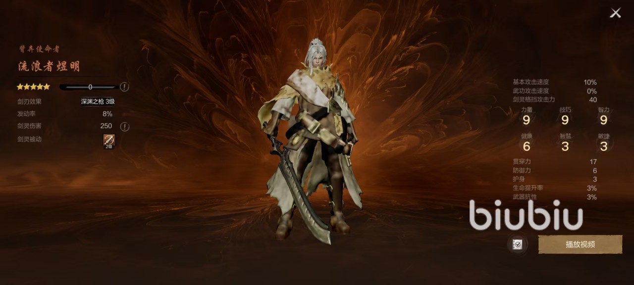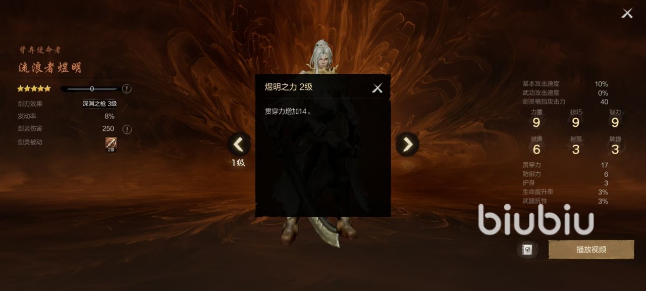 攻击命中带有深渊之伤的敌人时,有一定几率射出深渊之枪,造成相当于武器攻击力200%的伤害。冷却时间一秒钟。从这些技能效果不难看出,流浪者煜明就是为输出而设计出来的剑灵,实力非常强大。它还拥有被动效果煜明之力,增加贯穿力。在其他属性方面,自身的力量、技巧、智力都是9点,健康6点,智慧和敏捷是3点,在贯穿力、防御、生命提升、武器抗性等方面,也都符合自身传说级的特点。