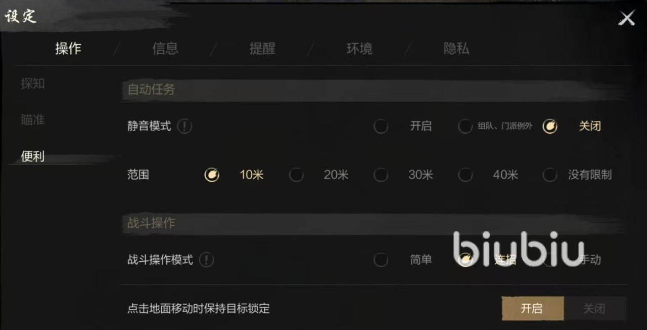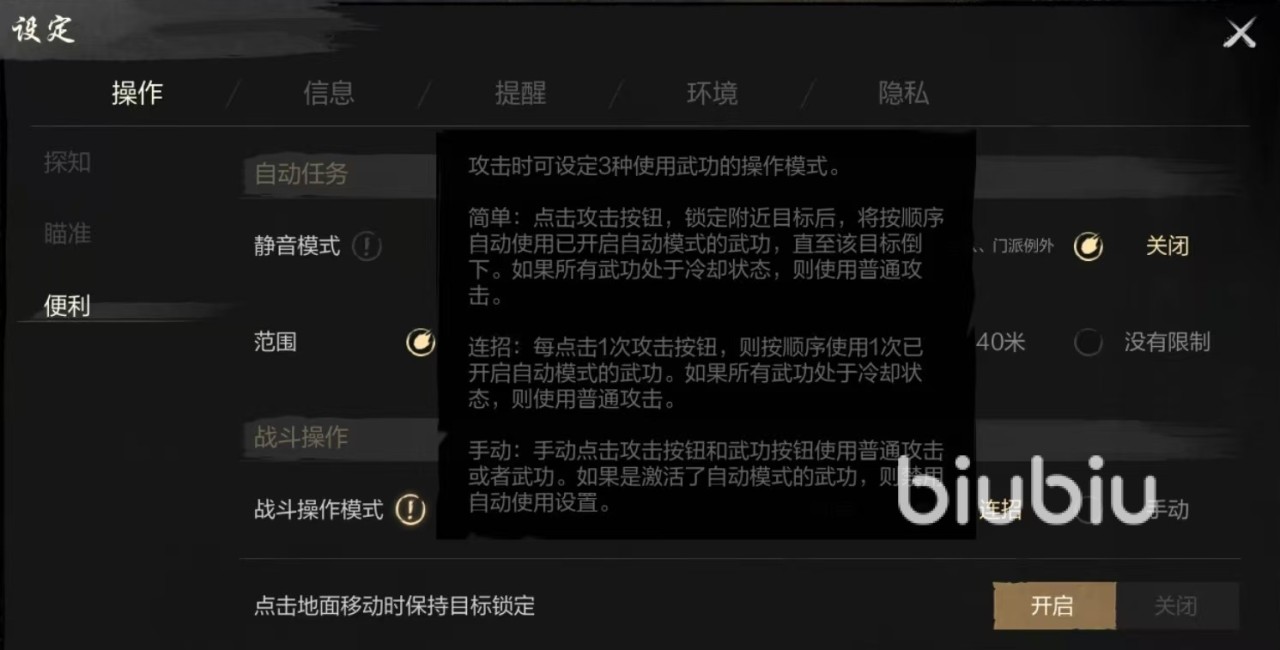 设定完毕后再来到下面的便利功能,找到其中的战斗操作,战斗操作模式有三个,分别是简单、连招和手动,一般来说,大多数战斗只需要选择连招就足够了。每次点击一次攻击按钮,就可以按顺序使用一次已经开启自动模式的武功,如果所有武功处于冷却状态,则使用普通攻击。除了难度较高的战斗之外,连招是最方便的。下面有一些选项非常关键,尤其是点击地面移动时保持目标锁定,这一点大家一定要开启,这是完成锁定攻击的重要方面。