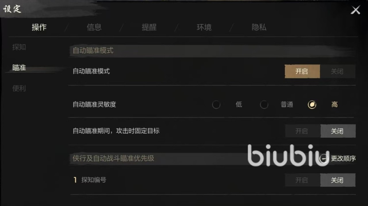 进入游戏中,点击设置,从中找到操作选项,这里面有探知、瞄准和便利这三个不同的类型。探知并不是今天所需要的,先来到瞄准,这里有一个自动瞄准模式,大家先点击开启,底下有一个自动瞄准灵敏度,这里可根据自己的需求去选择,一般来说选择普通就足够了。第3个是自动瞄准期间攻击时固定目标,这一点小编建议大家开启,开启了之后就不会随便切换目标,尤其是在和其他玩家pk的过程中非常重要。
