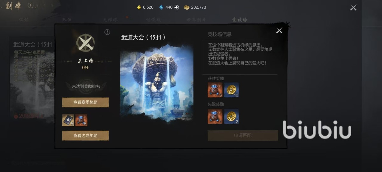 大家需要等级达到20级以上的时候才能在这里参赛,点击申请匹配,就可以根据当前的分数来匹配合适的对手。大家从一开始没有分数,战胜对手后将获得积分,竞技场中有不同的分级,从蒙昧无知开始,一直到三流、二流、一流、超一流和绝顶等,最高荣誉是无极。凡是能获得无级的玩家,都是服务器中的佼佼者。另外武道大会采用的是赛季模式,赛季只要达到相应名次,就会赠送星光剑灵召唤券,绑定神石袋等奖励,还有相关的成就奖励。