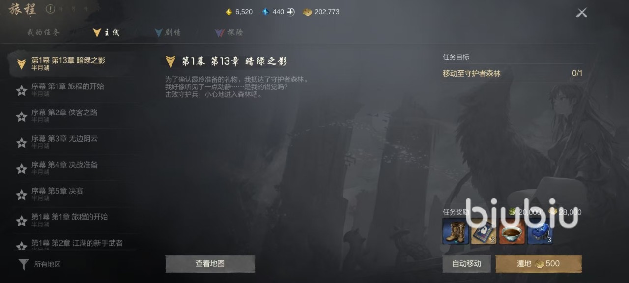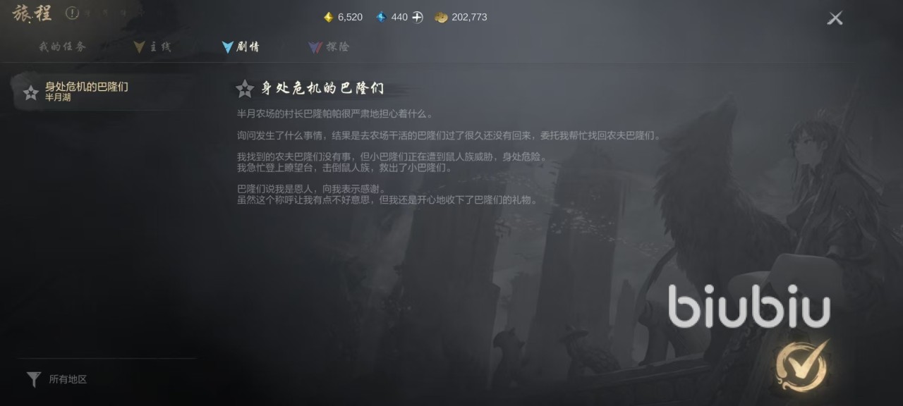 在主页面中进入到旅程功能之后,可以看到有多个不同的选项。首先看一下任务分类,包括主线、剧情、探险这三个类型。其中主线是大家升级所必需的,经验多还会给予很多前期提升实力所必需要的道具,装备,铜币等。主线任务也会引导大家前往大世界的各个区域,解锁更多的储存点。剧情则是随着主线任务推进,呈现出来的系列任务,剧情任务给予经验和道具奖励也很多,会随着等级不断解锁更多剧情任务。