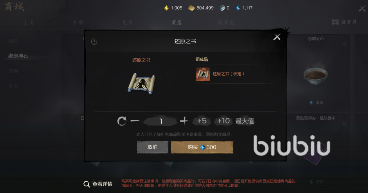 还原之书的价格颇为不菲,前期大家可先在游戏里打开商城页面。这时便可点击绑定神石,花费300个绑定神石即可购买一张。所以不是土豪玩家的话,不要轻易挥霍这件物品,毕竟每次还原也要重新学习剑诀了!