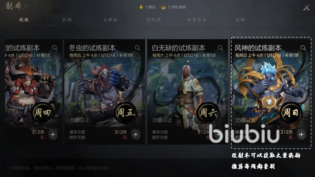 目前副本是有所调整的,之前的刷新时间是每天,现在改为每周刷新,如此一来小伙伴们每天任务的负担就大大减轻了,可以选择在周末的时候去打副本,此时大家的战力也是比较高的,当然,小伙伴们也可以根据自己的时间灵活来调整。