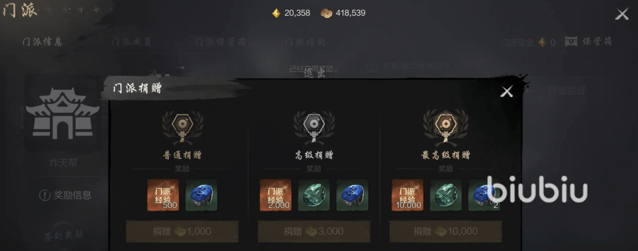 加入门派不仅能享受到门派的福利,还能提供面板属性的加成,最高能轻松帮助获取5000生命值,大家在选择好一个加入后,每日登录时一定要记得进行门派捐赠,这个捐赠三个等级,额度越多自己门派能获得的经验值就越高,提供的面板属性加成也就越多,而且每次进行捐赠还能得到一次奖励,建议大家每次进行的时候都选择最高档,这样既能做贡献又能享受福利。