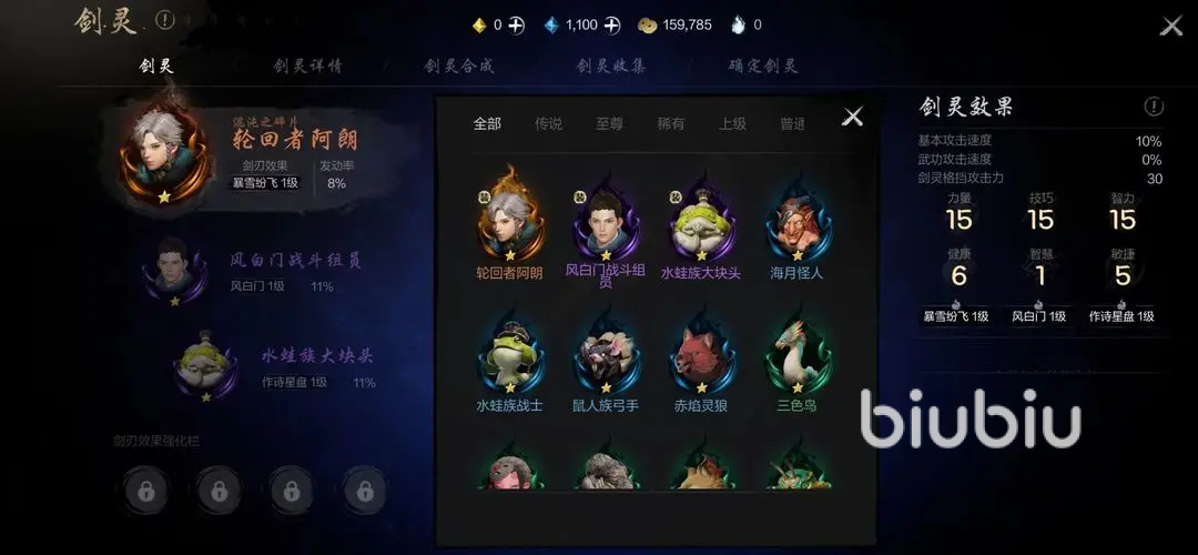 该系统主要用于解锁武器新属性,释放潜力。剑灵有品质的区分,从高到底是,传说(粉色)、至尊(橙色)、稀有(紫色)、上级(蓝色)、普通(绿色),根据颜色也能区分他们的品质。点击其图标就能查看已经拥有的,而已有的会高亮提示。