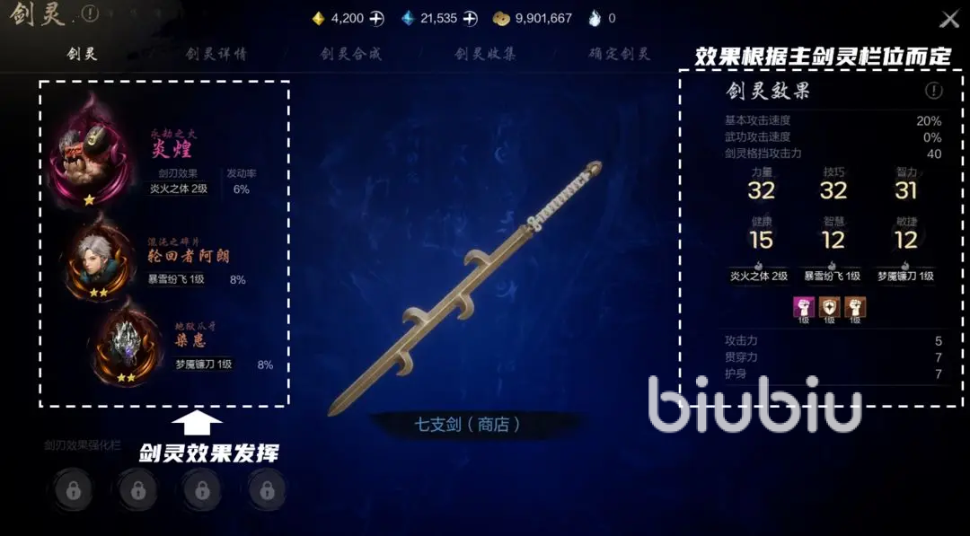 能力值:是由1个主位,外加2个辅位的能力相加得到的,主位能得到完全的发挥,但是辅位只能各发挥50%的能力值,至于基本的攻速,武功附带的攻速,以及格挡攻击力这几个基本效果都是取决于主栏位的剑灵的,那使用哪个栏位打头阵就非常重要,可根据职业点数需求,搭配更合适的剑灵使用。