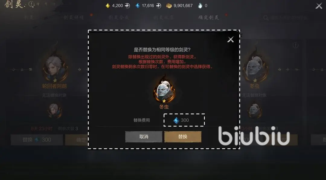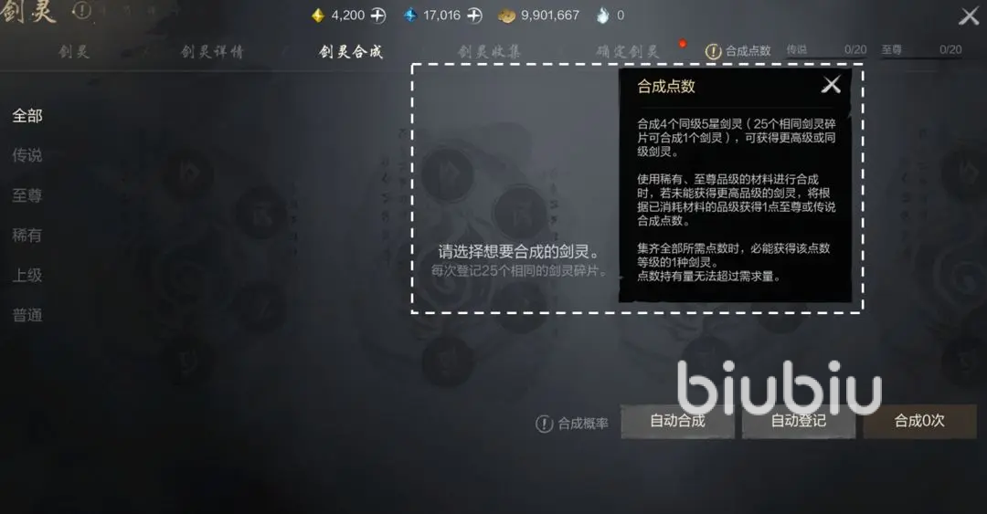 剑灵合成与收集:当剑灵养成到5星之后,能使用多余的碎片进行合成,4组相同品质的25个剑灵碎片就能合成1个完整的剑灵;每次获取或者升级的全新剑灵都会被收录在"剑灵收录"当中。其次就是确定剑灵,要选择最适合自己使用的剑灵,在获得了至尊或以上的剑灵之后,大家就要在“确认剑灵”当中使用功能“确定”来选定这个剑灵,而不想要这个剑灵的话,需要消耗神识重新抽取其他相同级别的剑灵。