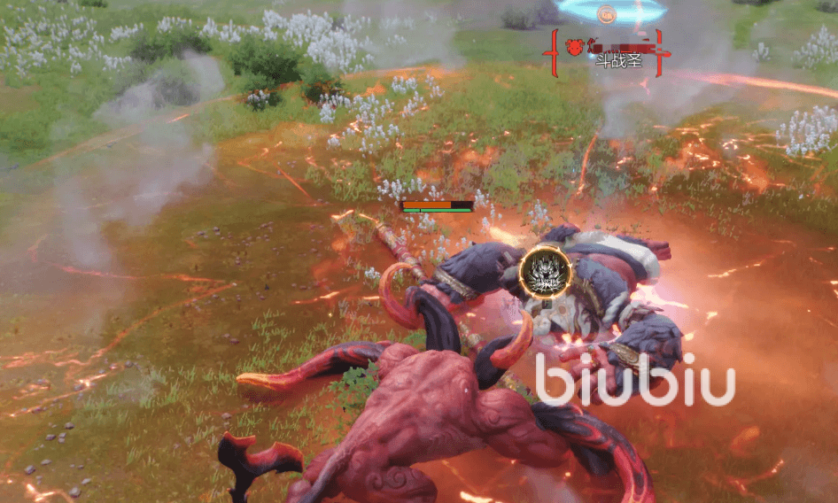 斗战圣作为试炼七霸之一,十分擅长棒术,攻击力和防御都非常厉害,我们刚开打,它就会释放出一个蓄力瞬霹,这时会双手挥舞棒子对目标造成伤害并击退,威力非常高,不过释放时头顶上会出现一个“闪”,大家看到后只要及时闪避,成功后就可以进行反击输出。