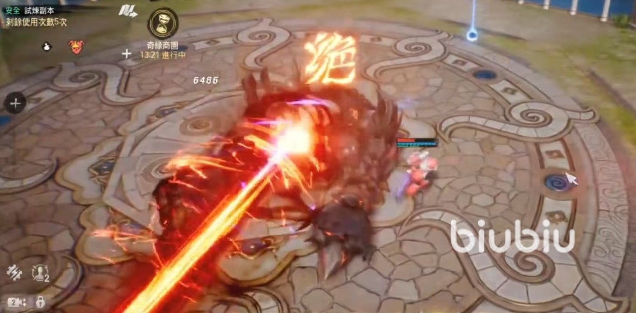 这个攻击伤害数值非常恐怖,但是朝着正前方喷射的,所以使用位移技能躲在左边、右边或者是怪物的后方就可以避开,但是一定要快,不然命中之后会直接死亡掉。在直线焰火的第二阶段是火焰球攻击,持续释放出火焰旋风,火焰和巨大的旋风结合起来,带来高额伤害,还会被强大冲击力直接眩晕。这时需要停止输出,注意看地面上的黄圈,利用位移来躲开火球的投射区域。