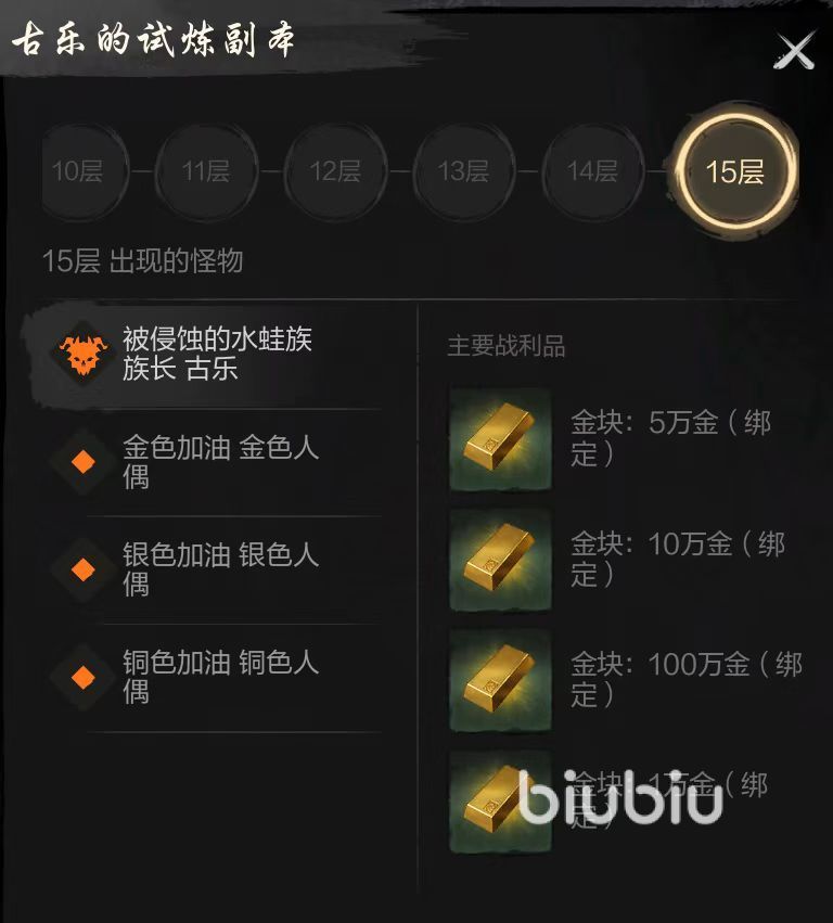 在最后的时候,古乐还有更凶猛的招式,覆盖广泛威力很大,释放大招锤击,此时boss头上出现挡字,如果成功格挡就可以接接下来给古乐打出致命一击。挑战这个boss胜利之后能够获得大量金条奖励,如果能够一路挑战到15层,可以获得百万金条,这也是获得金条最有效的途径之一了。