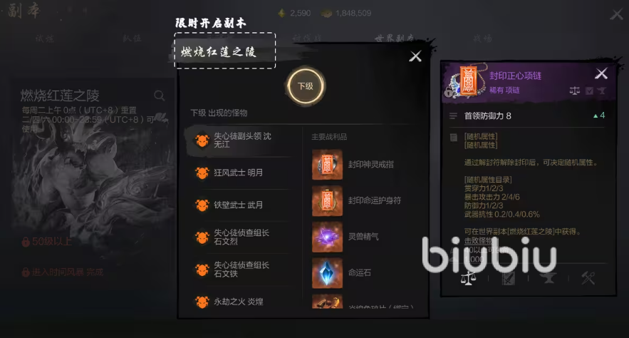 首先是主线任务,通过完成主线能获取一批普通以及上级装备,穿戴好它们能完成一些普攻难度的副本挑战,比方说红莲之陵,这个副本正好也是一些稀有武器或者装备的重要获取来源。