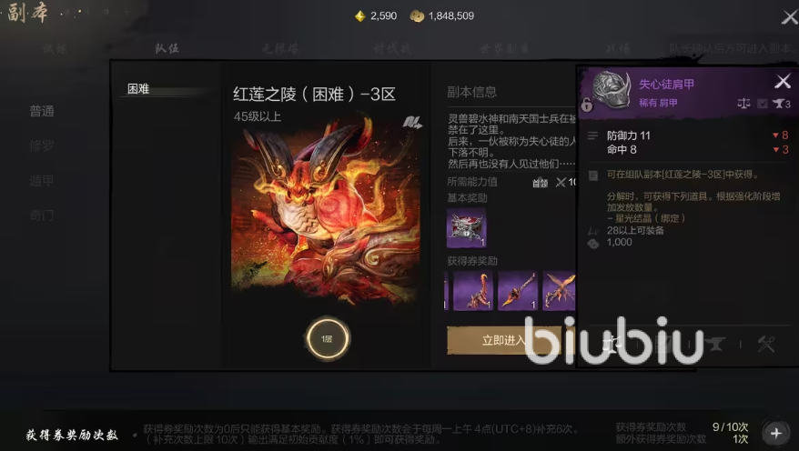 红莲之陵普通难度总共分为三个区域,每一个区域只有武器、灵锁会掉相同,其他防具等部位会有所不同,组队每周有10次机会挑战,玩家也可以通过消耗奖励获得券来增加次数。