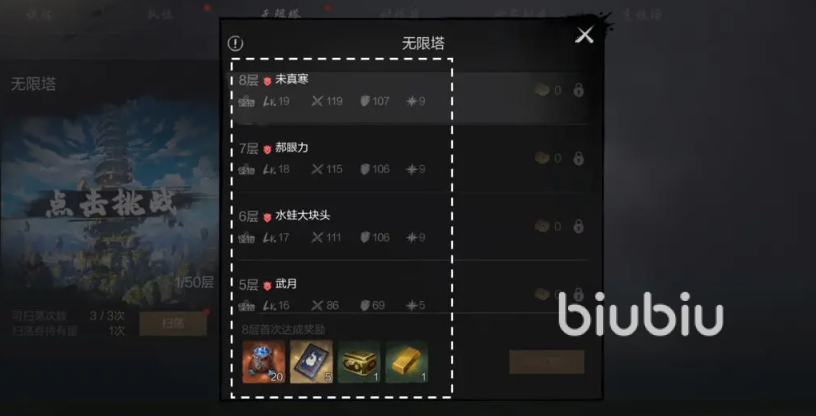 玩家在达到20级后解锁,最高可挑战50层。每层BOSS限刷一次,首次击败可获得奖励,挑战次数不设上限。建议在挑战前确认推荐等级和能力值,以确保顺利通关。此外,还可进行扫荡,每日最多三次,次数在每日凌晨4点重置,可快速获取对应奖励。