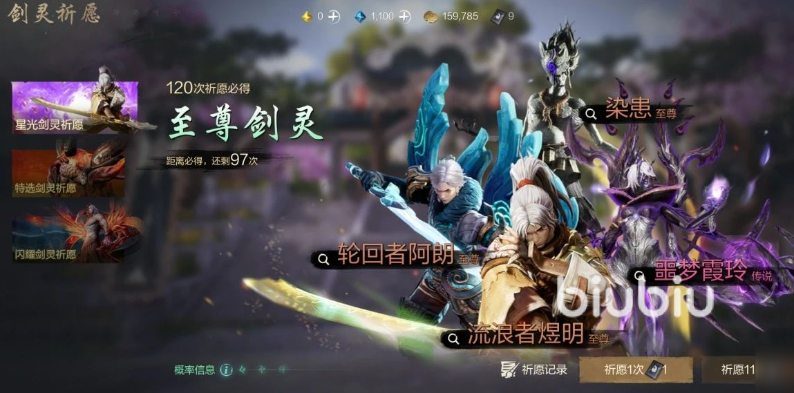 如果我们想要召唤他的话,那么可以来到剑灵卡池。就是所谓的剑灵祈愿,如果我们抽满120次的话,就可以100%获得一个橙色的剑灵。然后暴走守护兵队长就是一个橙色剑灵,所以我们可以不断根据自己的需求去抽取,不过不能保证100%获得。