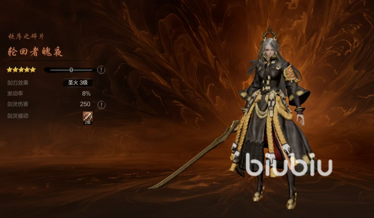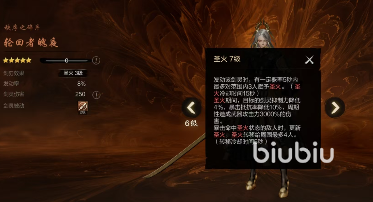 如果作为剑灵使用的话,可以让我们提升攻击速度以及其他方面的属性值。另外他的剑刃效果叫做圣火,之后就可以有一定的概率对敌人施加圣火。圣火可以降低对方的暴击率以及抵抗力,也可以不断增强我们的伤害,非常无解,另外还可以将圣火传递给周围的敌人,以此轻松成为大杀招。