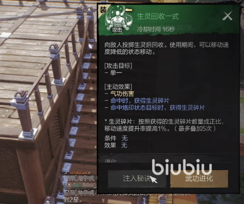 首先生灵回收作为这一系列武学的总称,一共带有二式。当大家使用之后,可以向敌人投掷生灵回收。且在使用期间可以进行移动,不过移动的速度会较为缓慢。当这招成功命中敌人时,就可以获得一定的生灵碎片。要是成功命中烙印状态的对手,同样可以获得一枚生灵碎片。