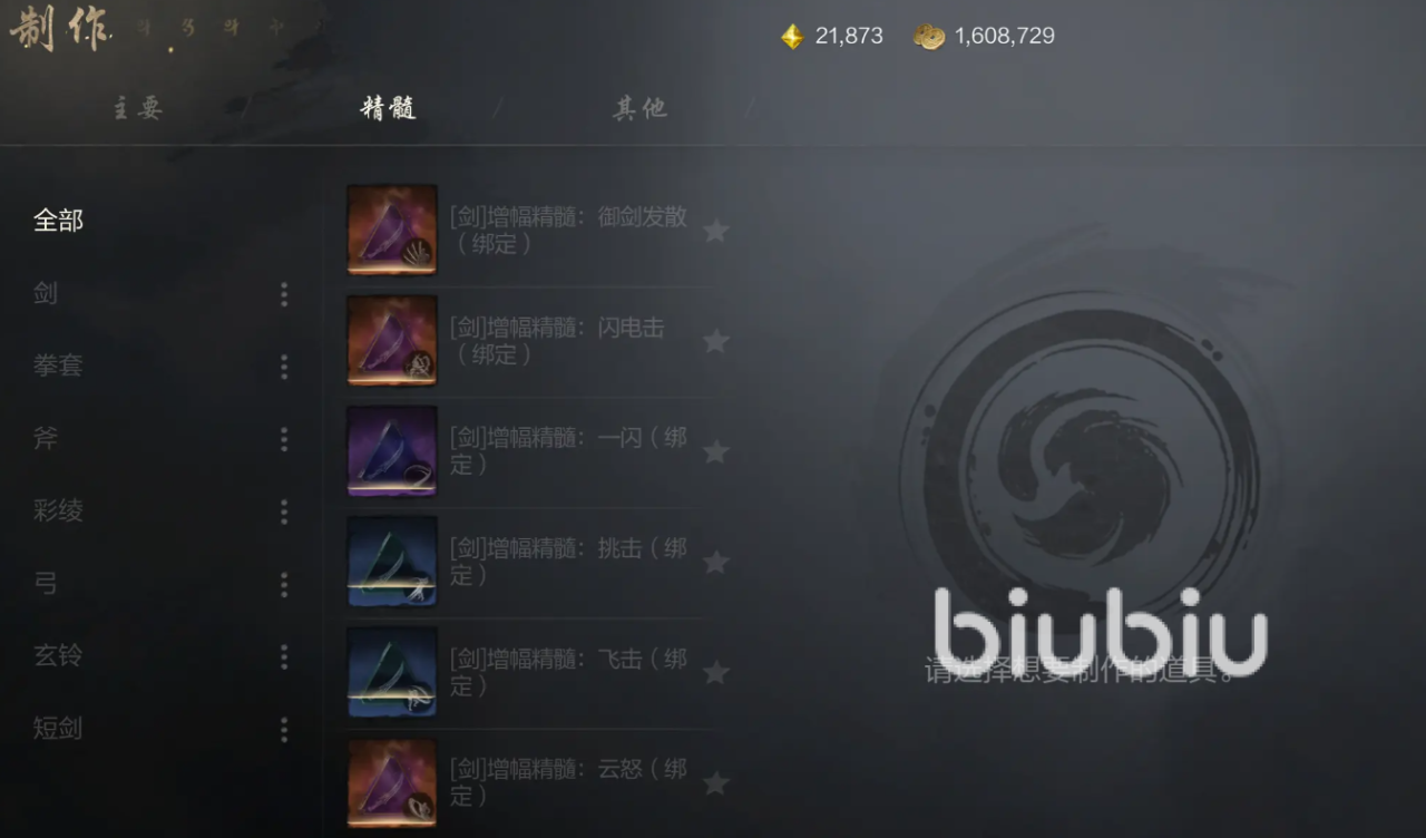 另外还有一个精髓板块,你的话会将武功所需要的精髓道具全部展示在一个栏目当中。我们只需要点击界面左侧的各个分类,即可找到不同武器武功所需要的精髓类型。不同武器上也有着相应的子分类,打开子分类之后,你就可以更快的找到需要制作的道具。