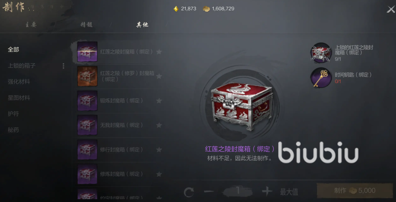 对于其他板块的话,可以将游戏中其他可制作的道具都整合在一起,也就是一些杂物。比如强化材料或者可以上锁的箱子,当我们找到足够多的材料时。需要点击三个板块中的一个,然后再点击相应的道具就可以打开制作页面,只需要消耗一定的金币就可以快速制作了。