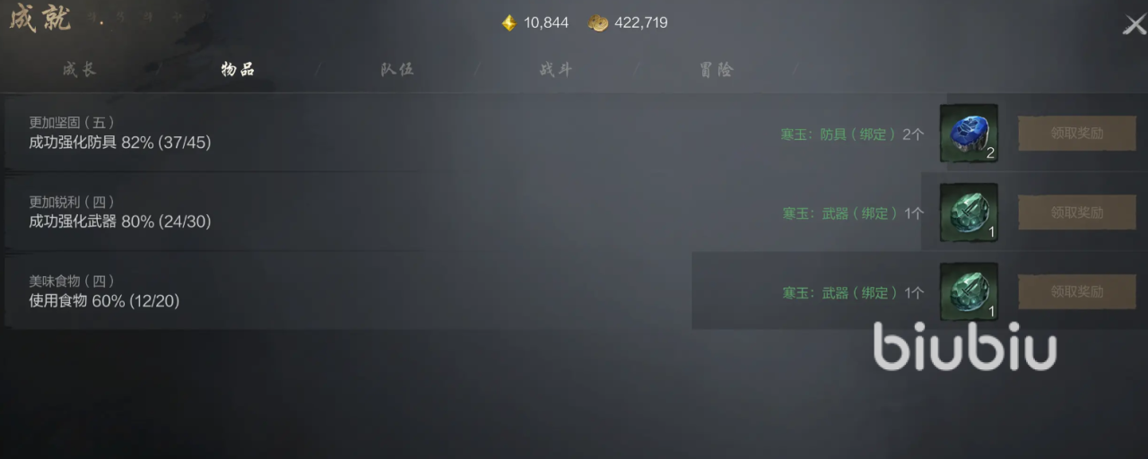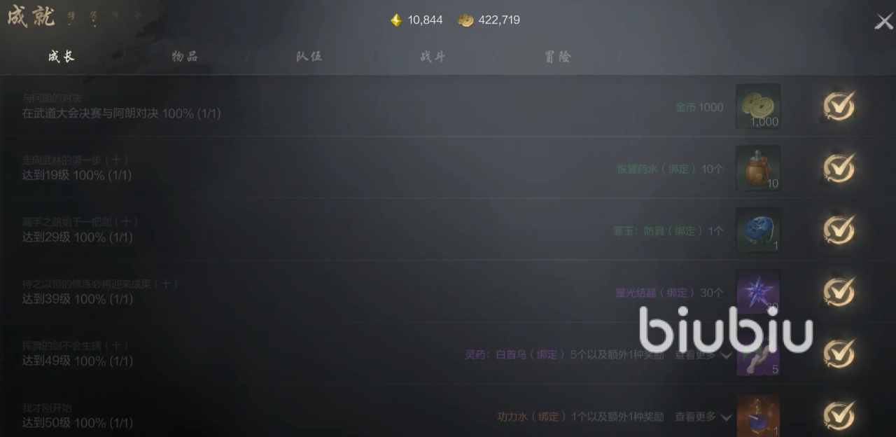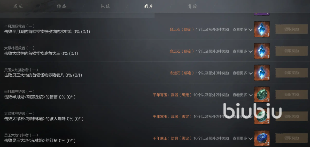 战斗板块的成就有至尊强化材料,完成方式为根据提示找到特定怪物击杀,队伍通过提供星光结晶,能用来体验命运星图,成长会提供数量有限的功力水,物品的成就提供的就是道具奖励。