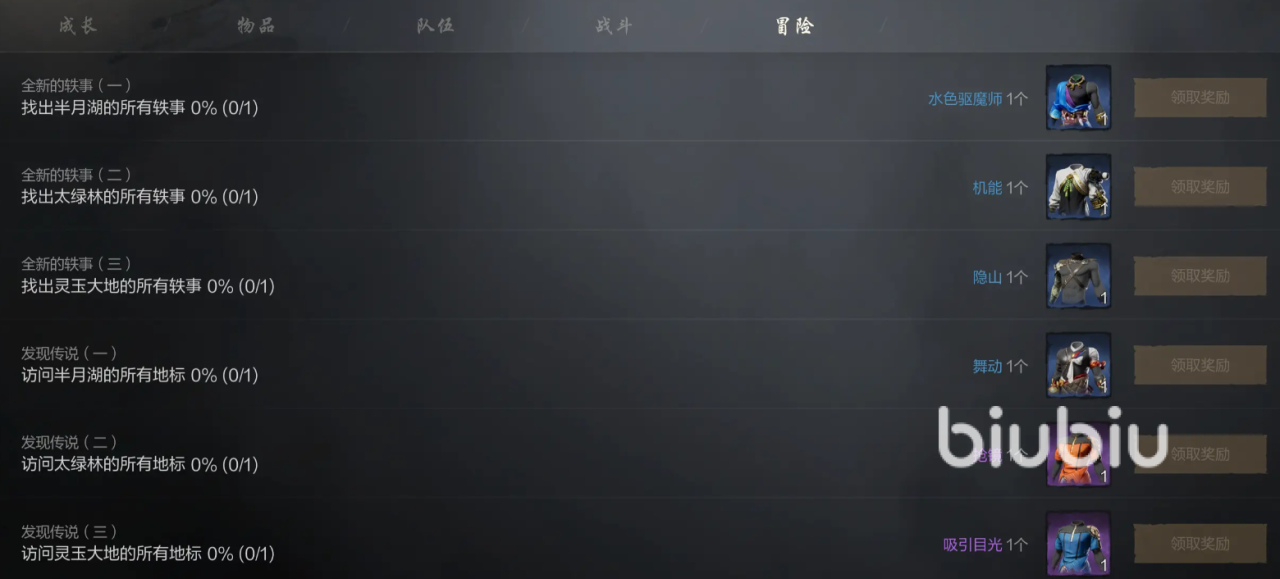 物品成就板块里,使用各种道具和强化装备就能触发,领取到相关的道具奖励,队伍需要完成各种副本组队,战斗要击杀各个不同区域的怪物,最后的冒险板块大部分成就都和觉醒回廊相关。